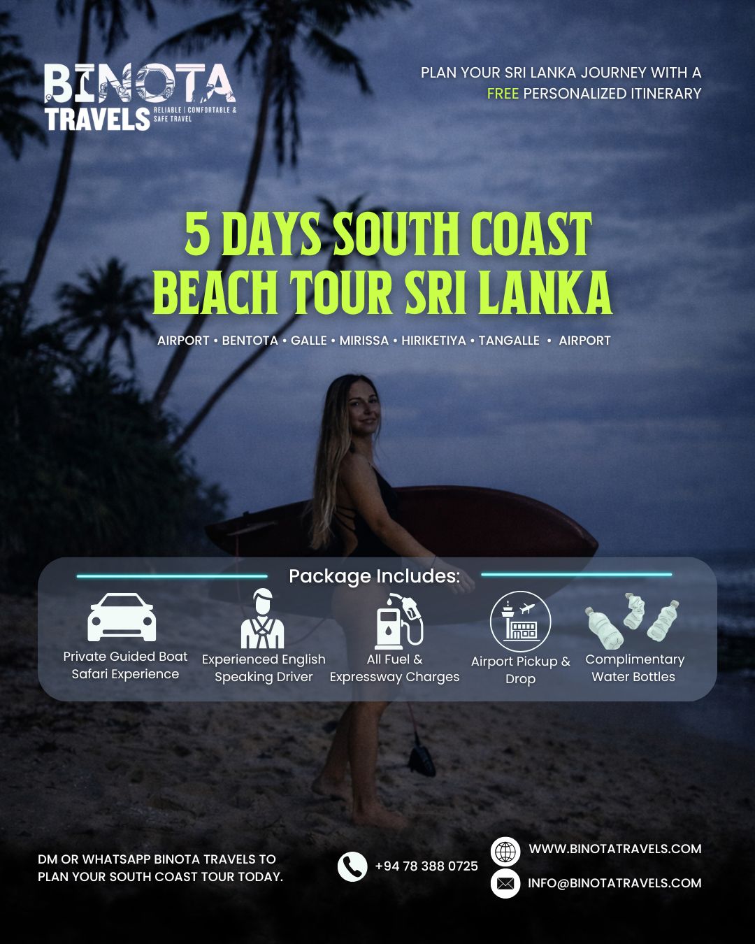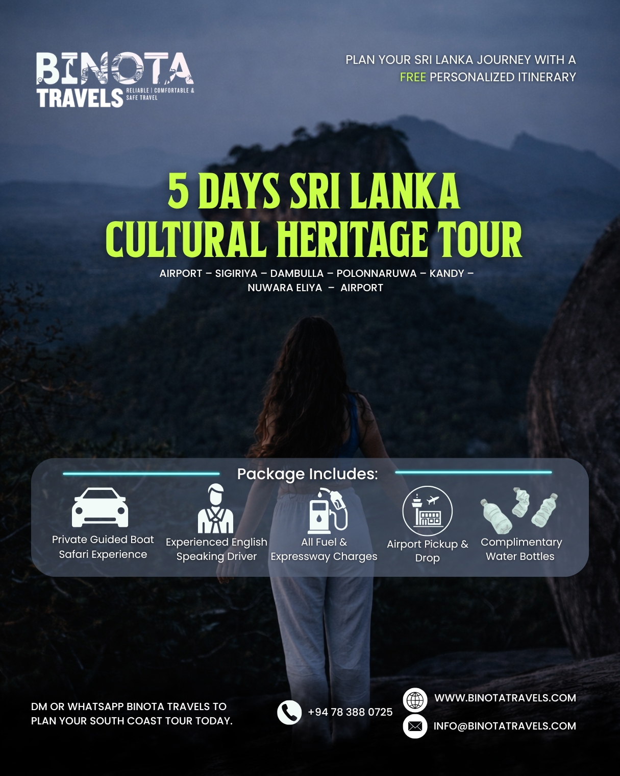 Binota Travels delivers premium private travel experiences across Sri Lanka. From airport transfers to fully customized round tours, we provide safe, comfortable, and stress-free journeys tailored to your needs.